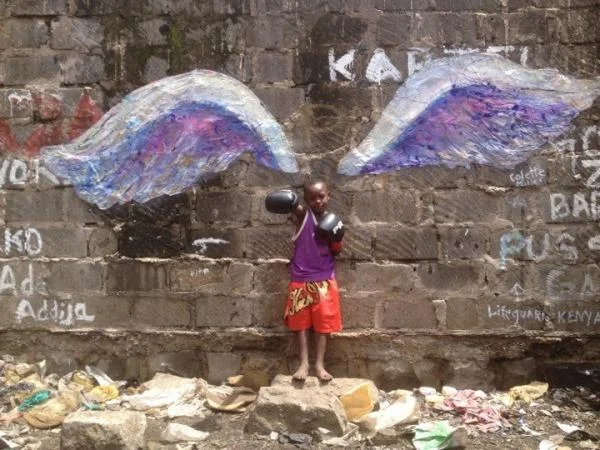 A boy in boxing gloves in front of the Koyale angel wings in Nairobi, Kenya