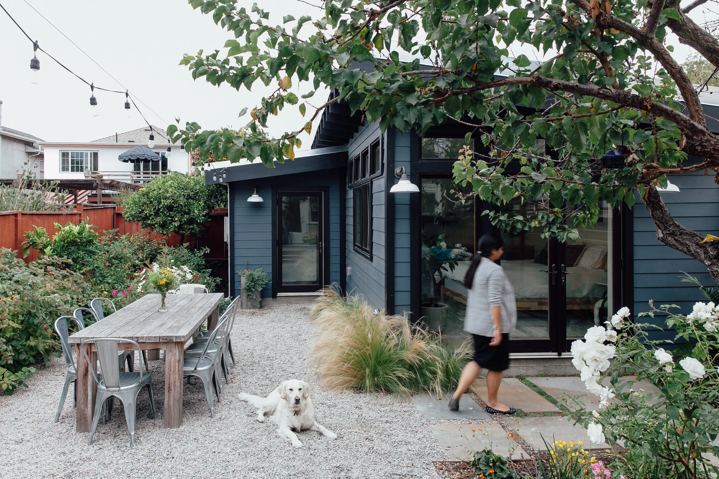 Ming outside a tiny house Atelier Cho Thompson designed for an Oakland, CA family.