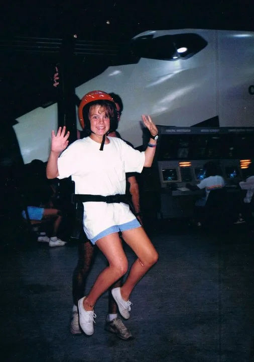 Rachel at Space Camp as a kid, trying out the 1/6 Chair. Rachel says, "The chair simulates the 1/6 gravity of the moon, so you bounce like you would when walking on the moon!