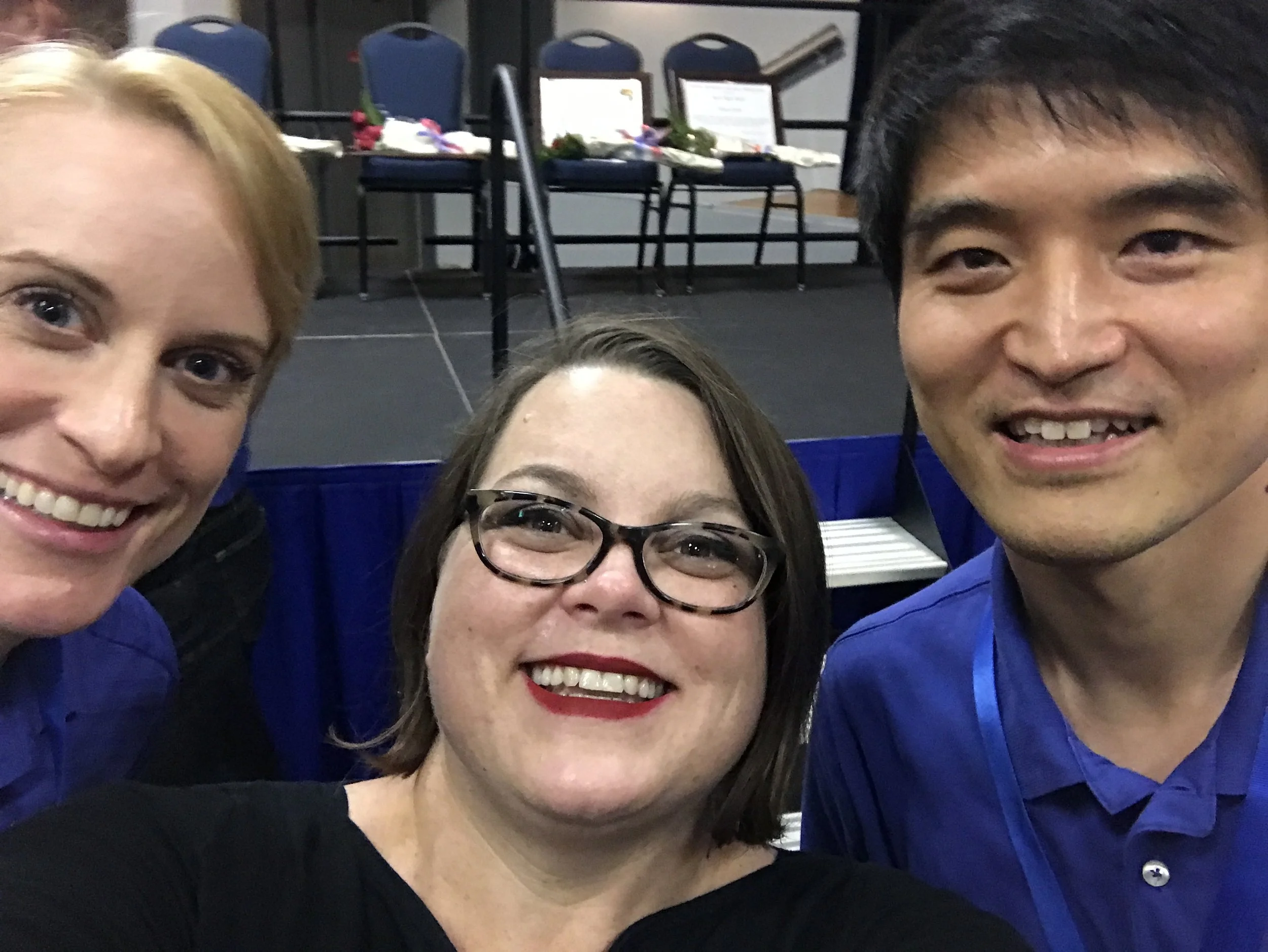 Rachel with astronauts Kate Rubins and Tak Onishi. She says, "They were a great pair for science storytelling aboard the space station. They captured some of the best (and most!) science imagery we’ve had in a long time. It was a pleasure to get to share their stories, and talk with them about their mission when they returned.