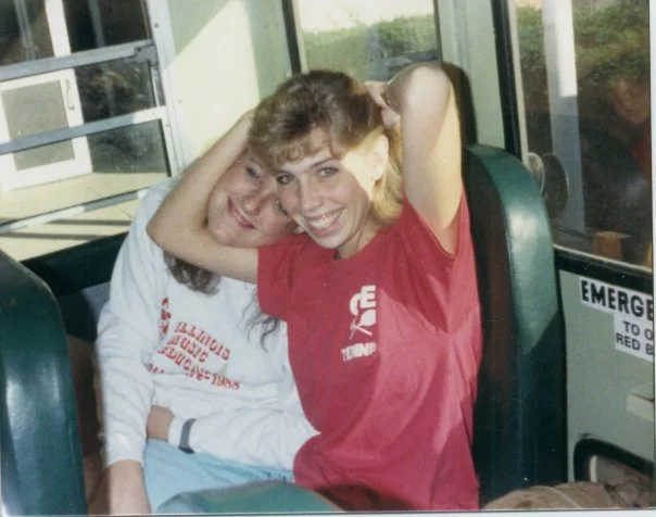 Stephanie (right) in her varsity tennis shirt on the school bus during high school. She played doubles and recalls, "I had a great partner and we just had a ball."